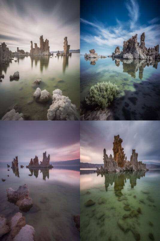 使用施耐德的另一张图片,这次是一张来自加利福尼亚莫诺湖的风景图片,Midjourney再次产生了大部分有用的文字描述,尽管有关于莫诺湖的错误位置信息。