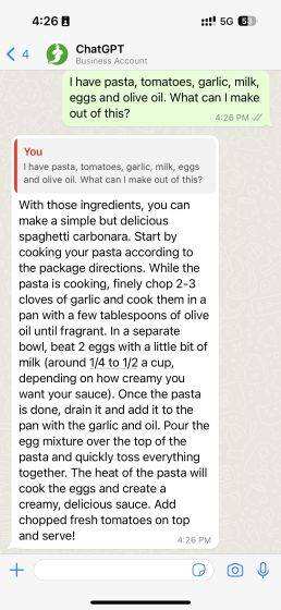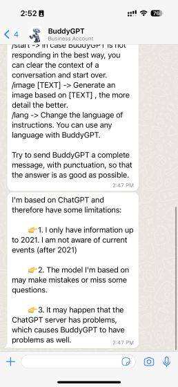 4. 现在您可以开始在WhatsApp上使用BuddyGPT。只需打出你的提示,然后发送过去。根据我们的经验,BuddyGPT可以立即给出答案,而且准确性很高。