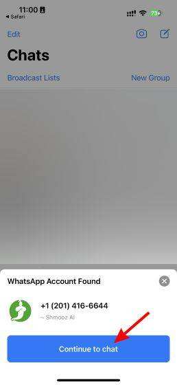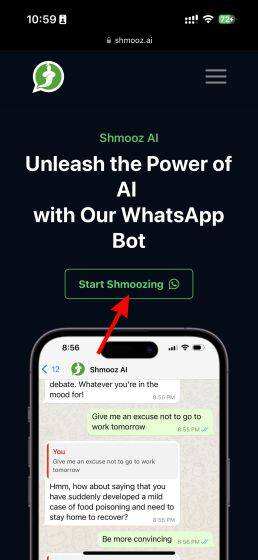 1. 在你的手机上,使用这里的链接访问Shmooz AI官方网站。点击 “Start Shmoozing” 按钮,你的WhatsApp将自动打开。