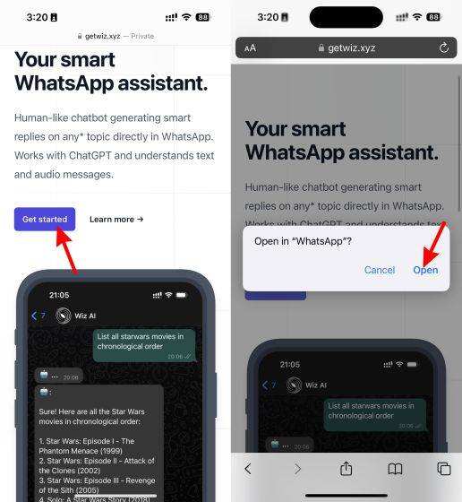 1. 在您的手机上,使用提供的链接访问WizAI的官方网站。点击 “Get Started” 按钮,您的WhatsApp将自动打开。当它要求获得许可时,点击 “Open” 按钮。