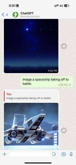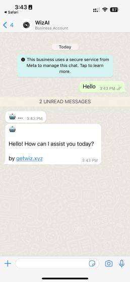 3. 就这样了。你不需要注册或提供任何其他细节。你可以简单地开始与WizAI交谈,并在WhatsApp中快速使用ChatGPT。默认情况下,你现在可以得到5条免费信息(以前是100条免费信息),所以要明智地使用它们。一旦你用完这个限额,你需要每月支付5.99美元。