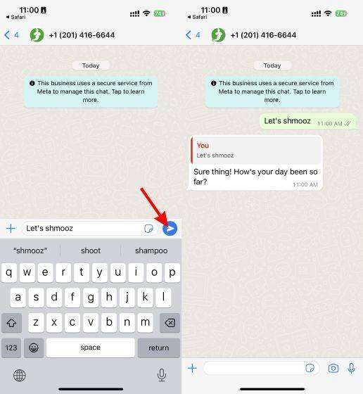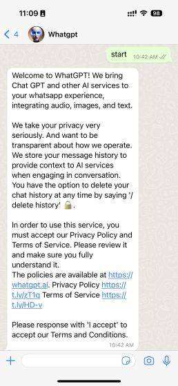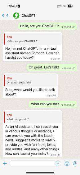 4. 就这样了! 你现在可以像使用ChatGPT一样在WhatsApp中与Shmooz AI交谈,它将立即作出回应。和以前一样,请注意,Shmooz是一项付费服务,只有5条免费信息。然后你需要注册一个高级级别,每月9.99美元起,可以无限次使用。