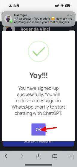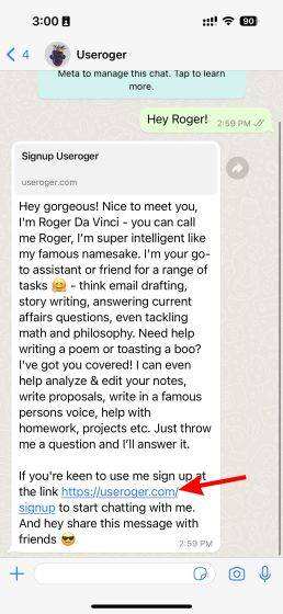 接下来,我们将使用Roger,它允许你在Telegram和WhatsApp上使用ChatGPT,很像BuddyGPT。Roger da Vinci是基于OpenAI的GPT-3模型,并针对细微的人类对话进行了调整。这意味着该机器人就像一个内容生成器和一个自然对话者的良好混合体。最重要的是,Roger AI聊天机器人目前是完全免费使用的。请按照以下步骤,在您的WhatsApp上快速设置它。