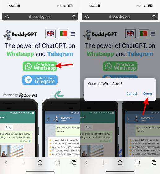 1. 在您的手机上,进入BuddyGPT的官方网站。在这里点击 “Try for free on WhatsApp” 按钮。如果出现了 “Open” 按钮,请点击它。