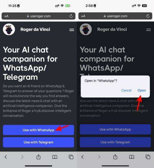 1. 在你的手机上,进入Roger AI的官方网站。一旦到了那里,点击 “Use with WhatsApp” 按钮开始。如果有要求,也请点击 “Open” 按钮。