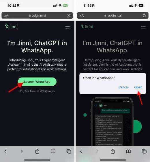 1. 在你的手机上,使用提供的链接访问Ask Jinni官方网站。点击 “Launch WhatsApp” 按钮,你的WhatsApp将自动打开。如果它要求获得许可,请点击 “Open” 按钮。