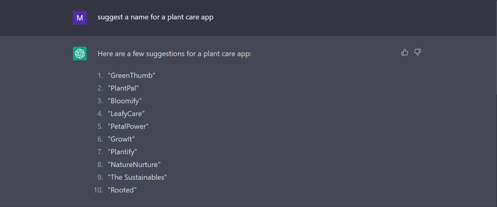 考虑到你几乎可以和ChatGPT谈论任何事情,Monika Buchelt决定试一试,让它为Monika Buchelt的应用程序起个名字。它很快就给出10个名字的清单,而且,完全诚实地告诉你,其中一些名字很不错。