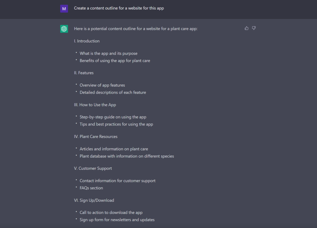 如果你正处于创作过程中,并迅速需要一些想法,不要犹豫,去ChatGPT。你至少会得到启发。但回到Monika Buchelt的网站。在聊天机器人帮助Monika Buchelt的植物护理应用程序命名后–最终选择了Bloomify–然后要求它为网站创建一个内容大纲。它是一个优秀的促进者。