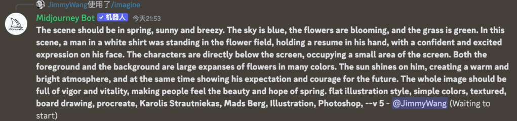 接着你就会看到一个叫 Midjourney 的机器人复述了你的话,在这句话的最后,有一句 Waiting to start,这就意味着你的 prompt ,机器人已经接收到了,正在为你生成图片: