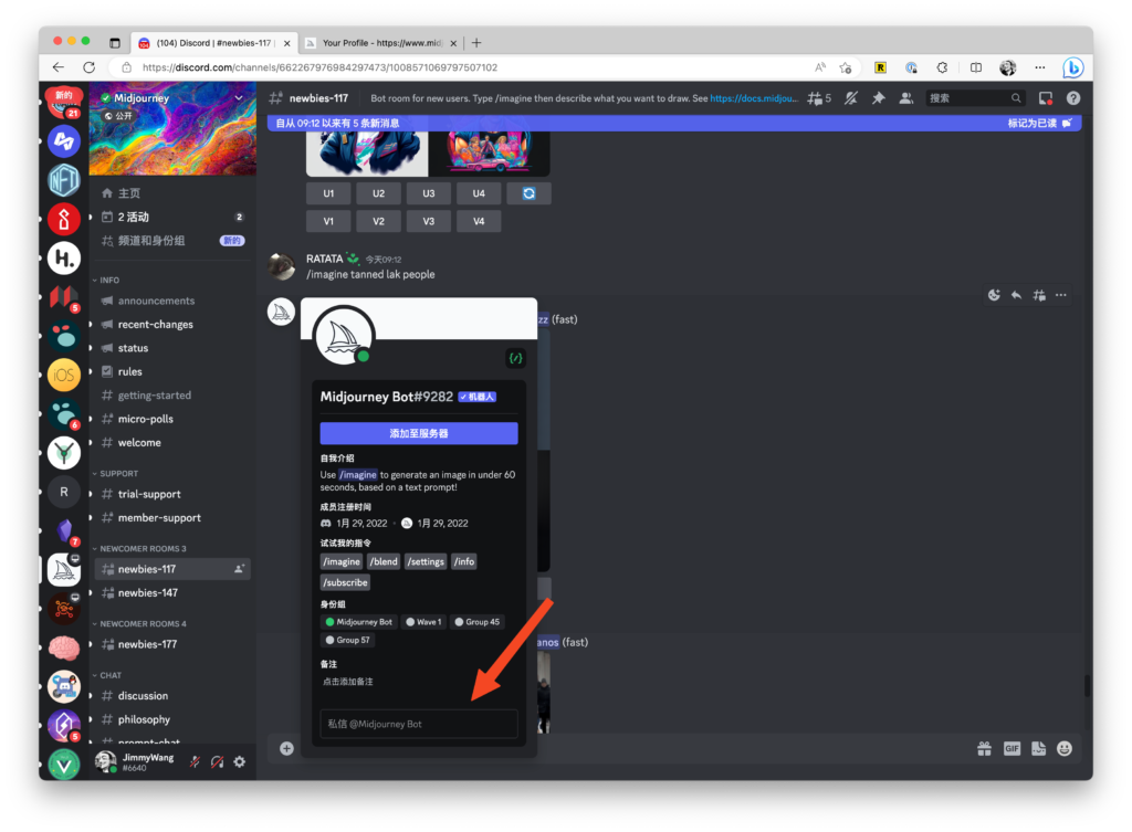 使用 Midjourney Bot 也很简单,跟在 Discord 的单聊比较类似,你只需要在 Midjourney 的 newbies-XXX 频道里找到 Midjourney Bot,然后点击它的头像,在弹出的菜单的下方有个「私信 @Midjourney Bot」的输入框,在这个输入框里,随便输入点内容,然后按回车发送。