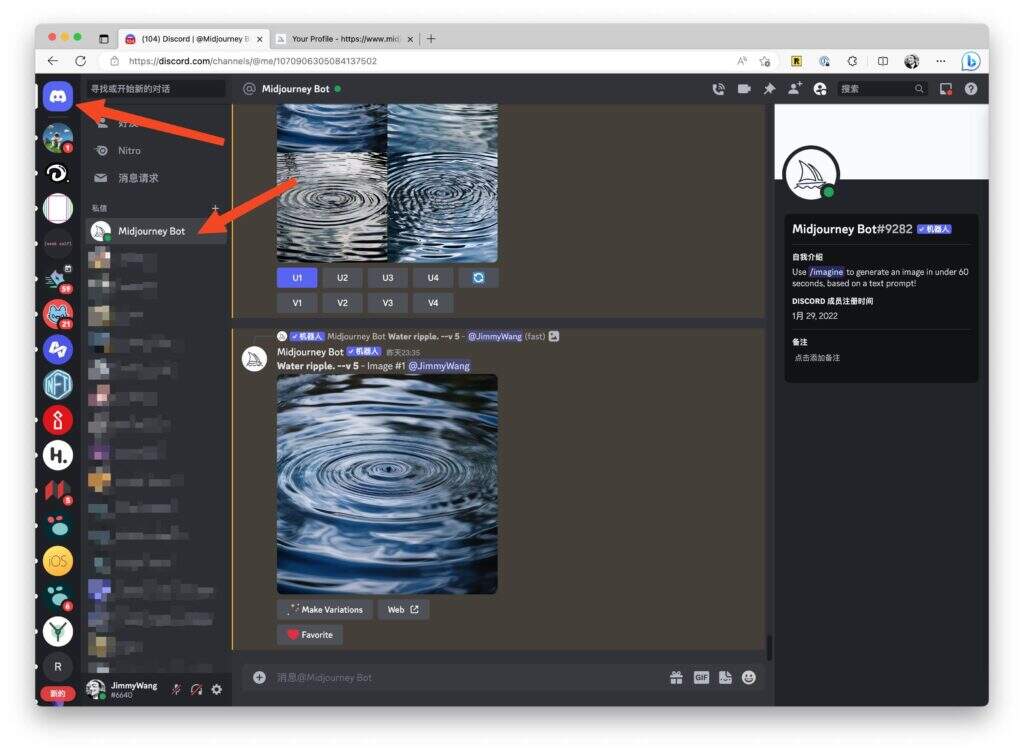 然后你就会在你的私信列表里看到这个 Midjourney Bot,使用方法就跟上面介绍的方法一样,无任何差别。