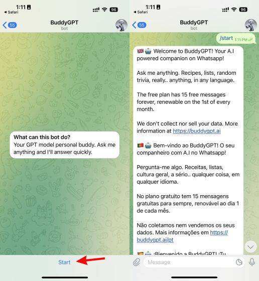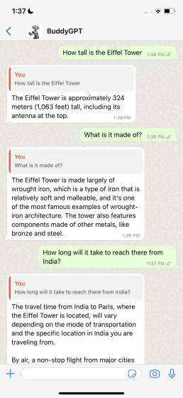 3. 这一切都完成了! 你可以立即开始与BuddyGPT聊天了,没有任何延迟。说到延迟,Telegram机器人几乎是即时响应的。我与机器人进行了一两次抽样聊天,包括生成图像,结果很顺利。然而,请注意,BuddyGPT每月只提供15条免费信息和5张图片,这是很低的。试试吧,以快速获得Telegram上的ChatGPT。