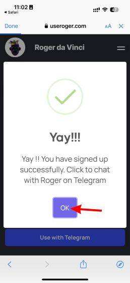 4. 一旦完成,你会收到一条确认信息,说明你的访问权限已被授予。只需点击 “OK“,即可回到Telegram,开始使用ChatGPT。