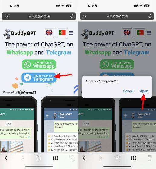 1. 在你的手机上,访问BuddyGPT的官方网站。在这里点击 “Try for free on Telegram” 按钮。如果出现了 “Open” 按钮,就点它。