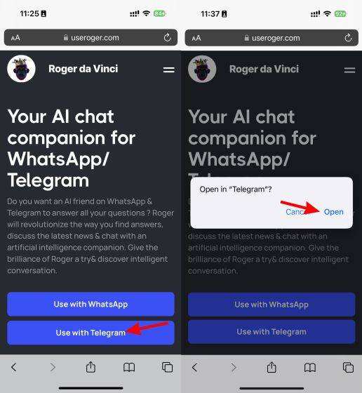 1. 在你的手机上,进入Roger AI的官方网站。一旦进入网站,点击 “Use with Telegram” 按钮开始。如果有要求,也可以点击 “Open” 按钮。