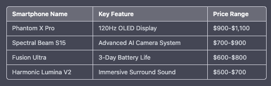 在这个例子中,ChatGPT生成了一个包含虚构的智能手模型号、其主要功能和价格范围的表格。通过指定所需的格式和内容,你可以从人工智能中获得组织良好、易于消化的信息。