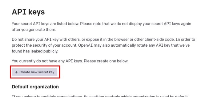 3. 在这里,你会看到所有以前生成的API密钥(如果有的话)。要生成一个新的API密钥,请点击 “Create new secret key” 按钮。