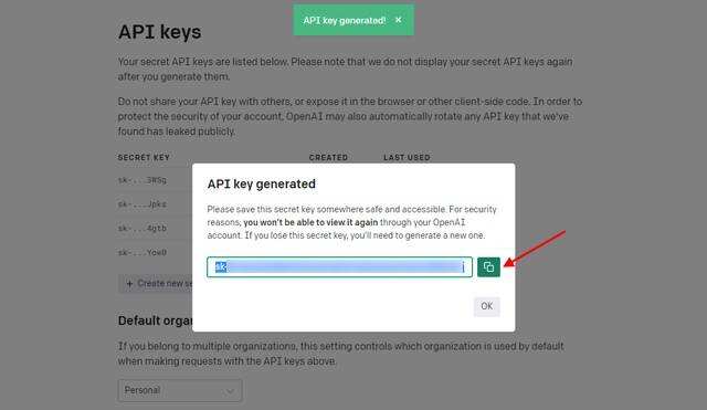 4. 一个新的弹出框将会打开,里面有你的API密钥。不要与任何人分享这个API密钥,也不要公开分享它。把你的API密钥复制到一个安全的文件或位置,因为你只能查看一次。在你点击这里的 “OK” 后,你将无法复制API密钥。