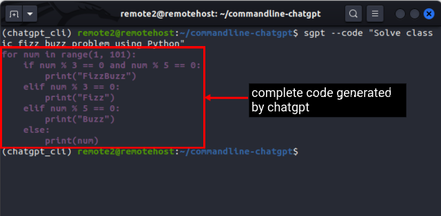 你甚至可以使用基于CLI的ChatGPT工具来解决编码问题或生成代码片段。只需使用 --code 标志就可以为你的提示生成代码,如图所示: