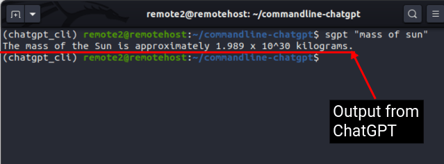 正如你在下图中看到的,运行上述命令后,默认的Linux shell提示符变为 (chatgpt_cli) remote2@remotehost 。