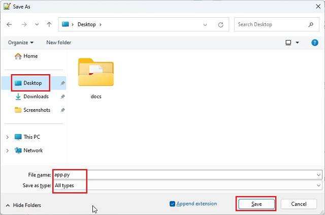 4. 之后,设置文件名 app.py,并从下拉菜单中将 “Save as type” 改为 “All types”。然后,将文件保存到你创建 “docs” 文件夹的位置(在我的例子中,是桌面)。你可以根据自己的喜好改变名称,但要确保是 .py 文件后缀。