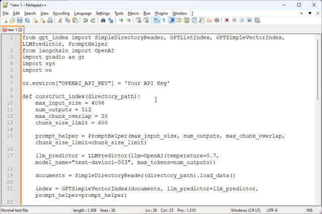 6. 再次回到Notepad++中的代码。在这里,用上面在OpenAI网站上生成的API密钥替换你的API密钥。