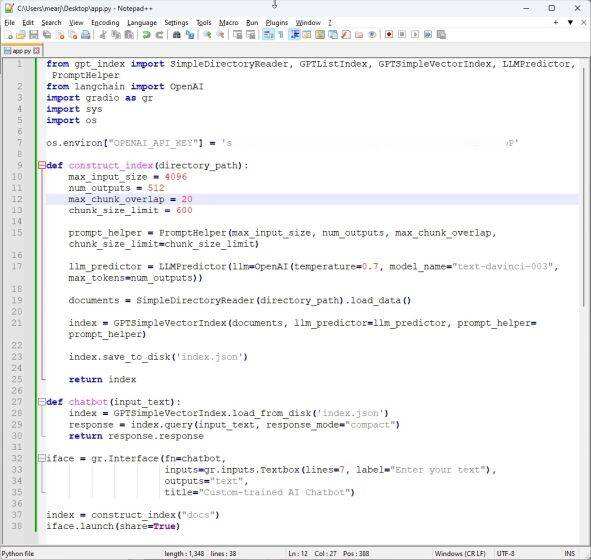 1. 现在,启动Notepad++(或你选择的代码编辑器),将下面的代码粘贴到一个新文件中。我再次从Google Colab的armrrs那里得到了很大的帮助,并对代码进行了调整,使其与PDF文件兼容,并在上面创建了一个Gradio界面。