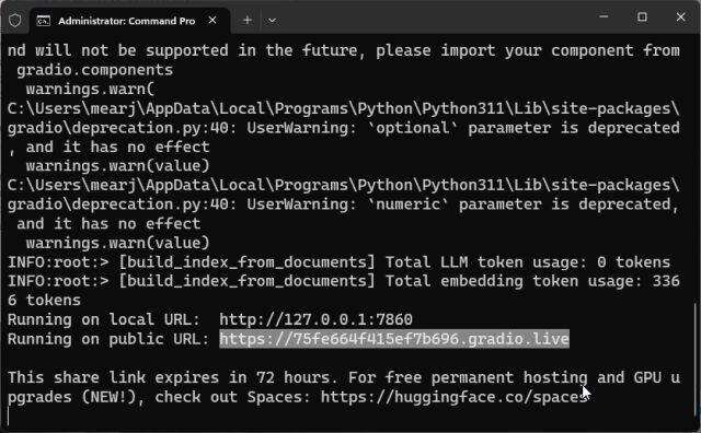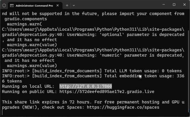 4. 一旦LLM处理了数据,你会得到一些警告,这些警告可以被安全地忽略。最后,在底部,你会发现一个本地URL。复制它。
