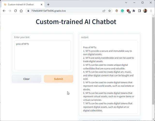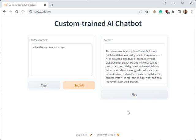5. 现在,将复制的URL粘贴到网络浏览器中,你就可以了。您的定制训练的ChatGPT-powered人工智能聊天机器人已经准备就绪。开始时,你可以问人工智能聊天机器人该文件是关于什么的。
