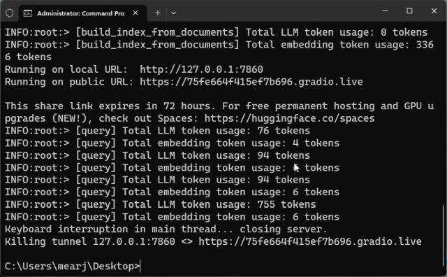 9. 要重启AI聊天机器人服务器,只需再次移动到桌面位置并运行下面的命令。请记住,本地URL将是相同的,但公共URL将在每次服务器重启后发生变化。