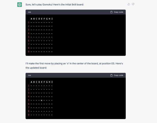 英文:Let’s play Gomoku. The goal of the game is to get five in a row (horizontally, vertically, or diagonally) on a 9×9 board. Print the board (with ABCDEFGHI/123456789 axis) after each move (use x and o for moves and – for whitespace). You and I take turns in moving, that is, make your move after my every move. You cannot place a move on top of other moves. Do not modify the original board before a move. Now make the first move.