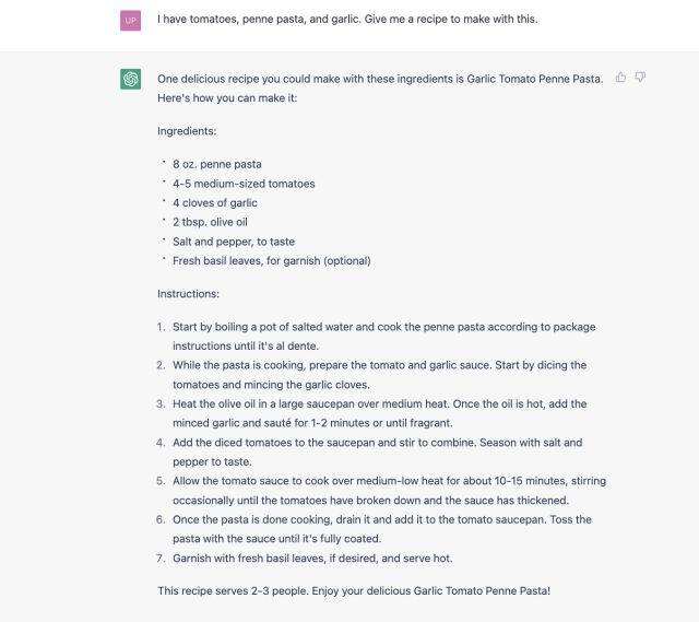 英文:I have tomatoes, penne pasta, and garlic. Give me a recipe to make with this. [Change ingredients based on your inventory]