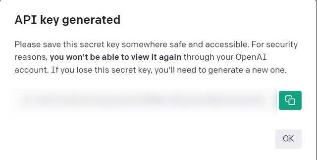 一旦完成,复制OpenAI的API密钥。请记住,一旦你复制了密钥并关闭了弹出框,你就不能再复制同一个API密钥。所以要把它放在安全的地方。