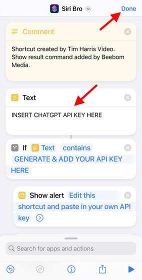 在第二个名为 “Text” 的对话框下,你会看到这样的信息–“Insert ChatGPT API Key here“。将您之前复制的API密钥粘贴在这里,然后点击右上方的 “Done”。