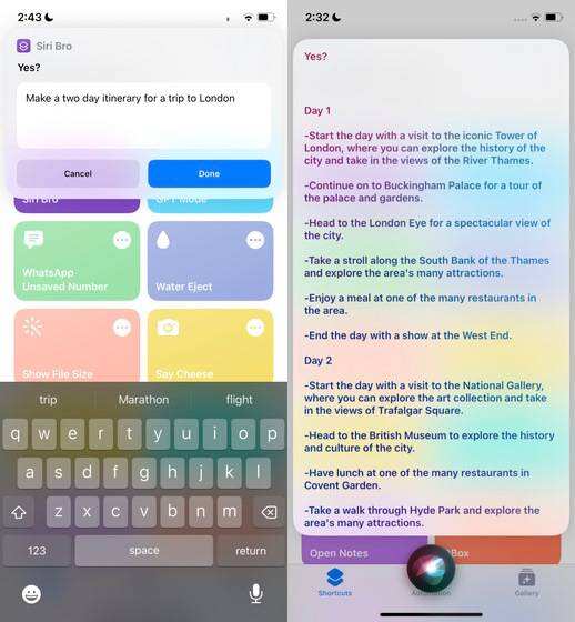 4. 然后你就大功告成了! ChatGPT现在已经与你iPhone上的Siri集成。你可以通过点击快捷方式应用中的Siri Pro,或者说Hey Siri,再加上快捷方式的名称(Bro、Pro或你自己重命名的标题)来调用快捷方式。正如你在下面看到的,我让ChatGPT Siri计划去伦敦的两天行程,它准确地做出了回应。