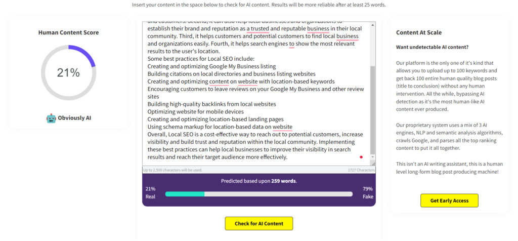 Contentatscale.ai在检测所有三个内容是人工智能写的方面做得很好,尽管第一个提示,它给出的是21%的人类分数。