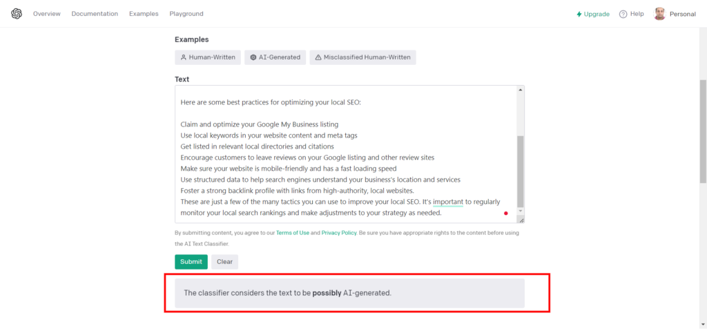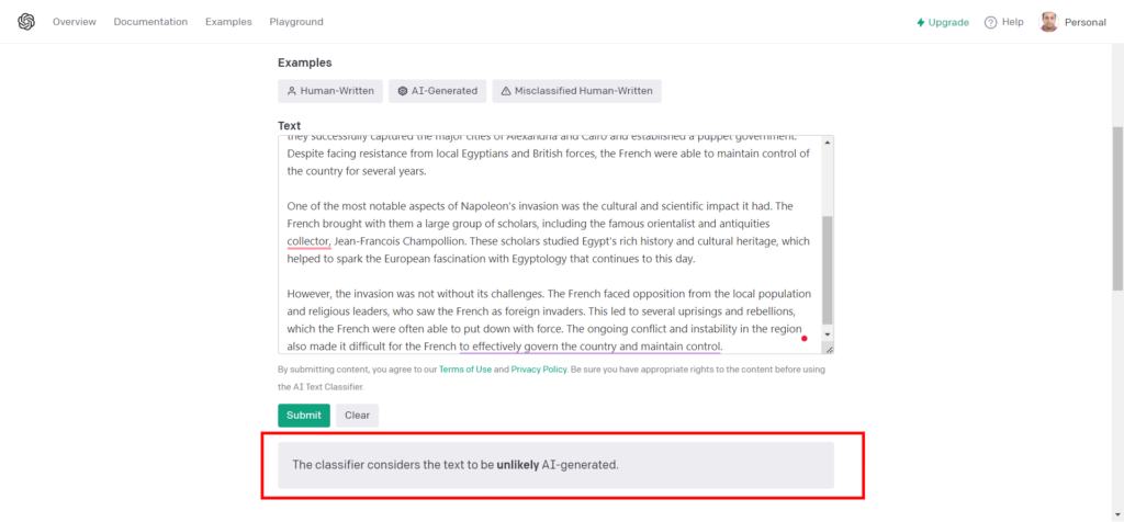 但令人惊讶的是,它在第2个提示中失败了,并将其归类为 “unlikely AI-generated(不太可能是AI产生的)”。我确实玩了不同的提示,发现就目前而言,在检查时,上述工具中很少有比OpenAi自己的工具更准确地检测出AI内容的。