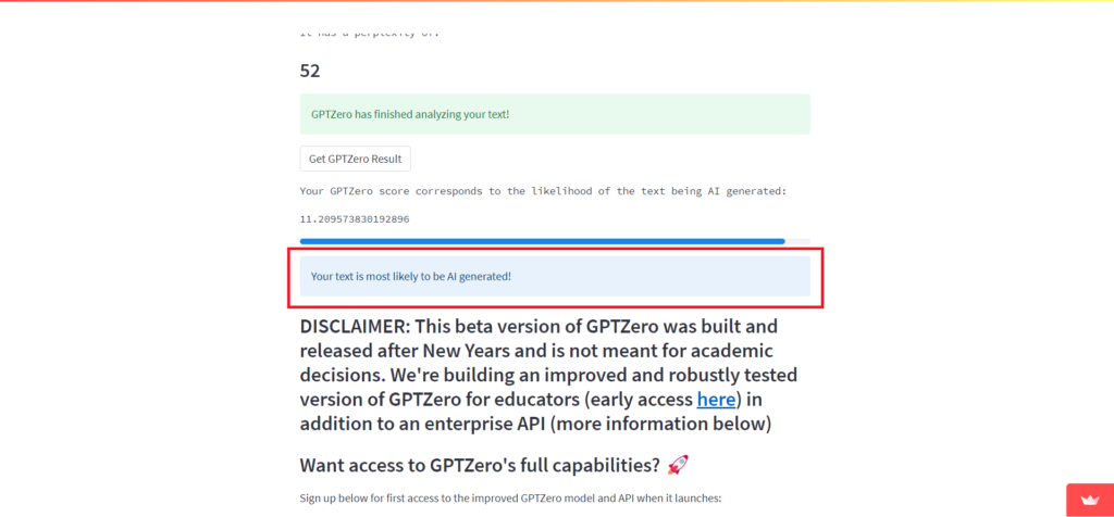 GPTZero检出ChatGPT内容为AI生成