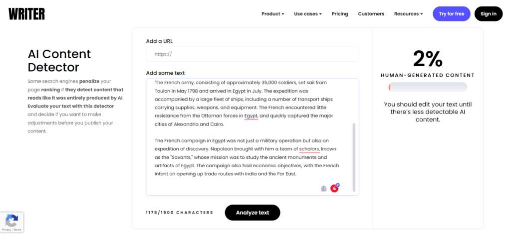 writer.com检测ChatGPT生成内容为AI生成