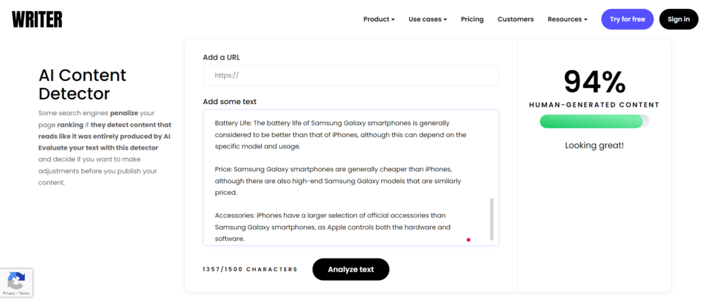 然而,当我测试真实的人类所写的文本时,Writer.com确实非常准确地将其识别为100%的人类生成的文本。