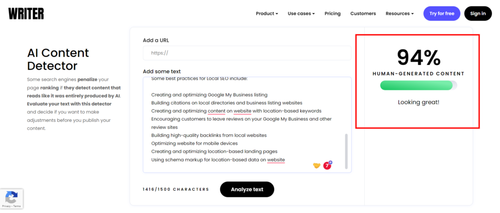 writer.com检测ChatGPT生成内容为人类创作