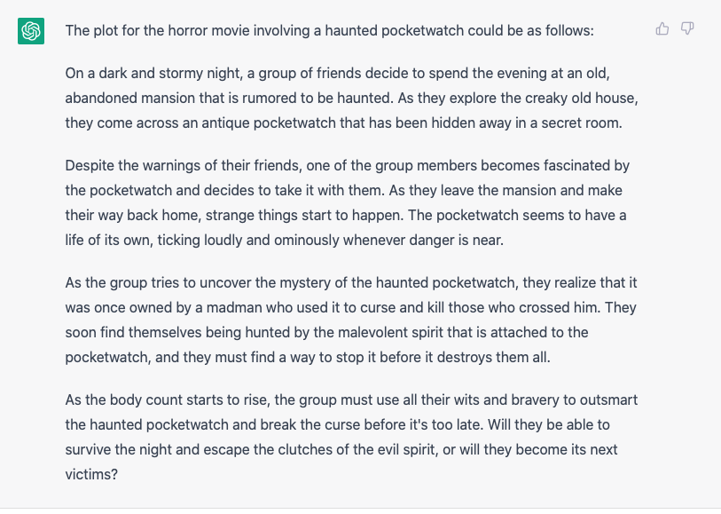 查询一部关于闹鬼的钟表的恐怖电影的情节,得到了一个令人难以置信的连贯(和有趣)的概要。这意味着即使是创造性的写作工作也可能面临风险。