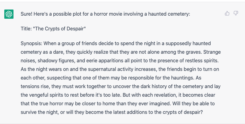 直到你对一部关于闹鬼的公墓的恐怖片进行第二次查询。这促使ChatGPT给你一个类似的故事梗概,但情节要点略有不同。