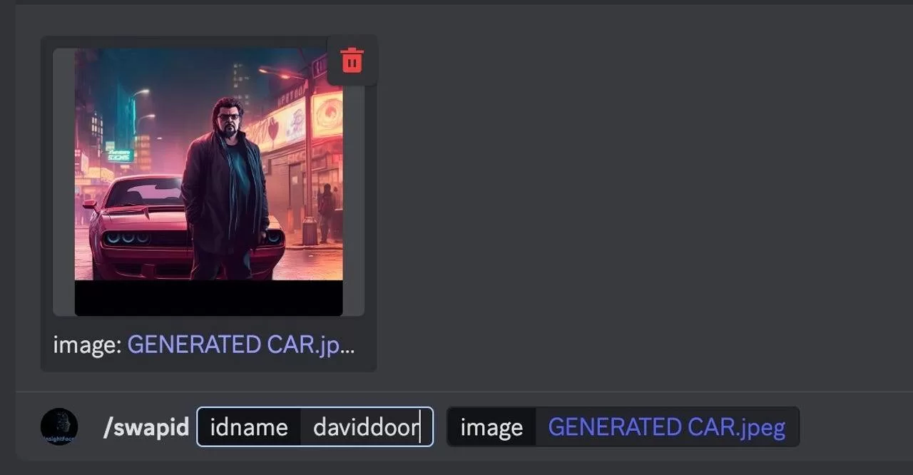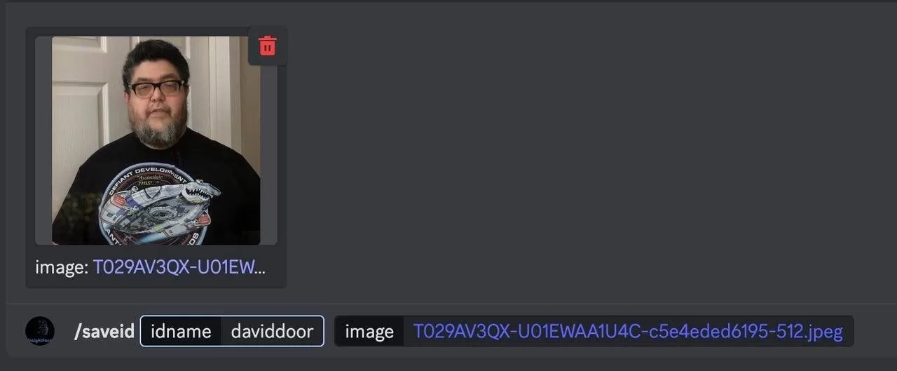 输入 /saveid 后,系统会给你一个上传图片的位置。然后,你需要给图片取一个 ID 名称。我把我的图片命名为 “daviddoor”,因为我正站在一扇门前。记住这个 ID,因为下一步你会用到它。