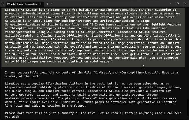 3. 接下来,我要求 Open Interpreter 对一份本地文本文件进行摘要,效果很好。