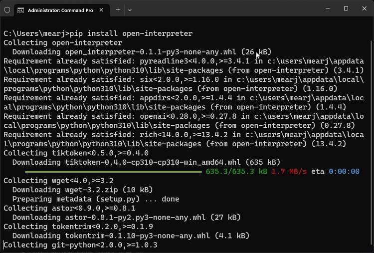 3. 现在,运行此命令在机器上安装 Open Interpreter。