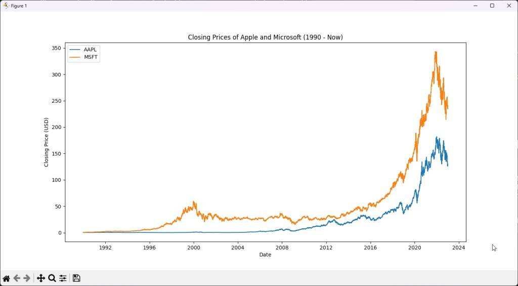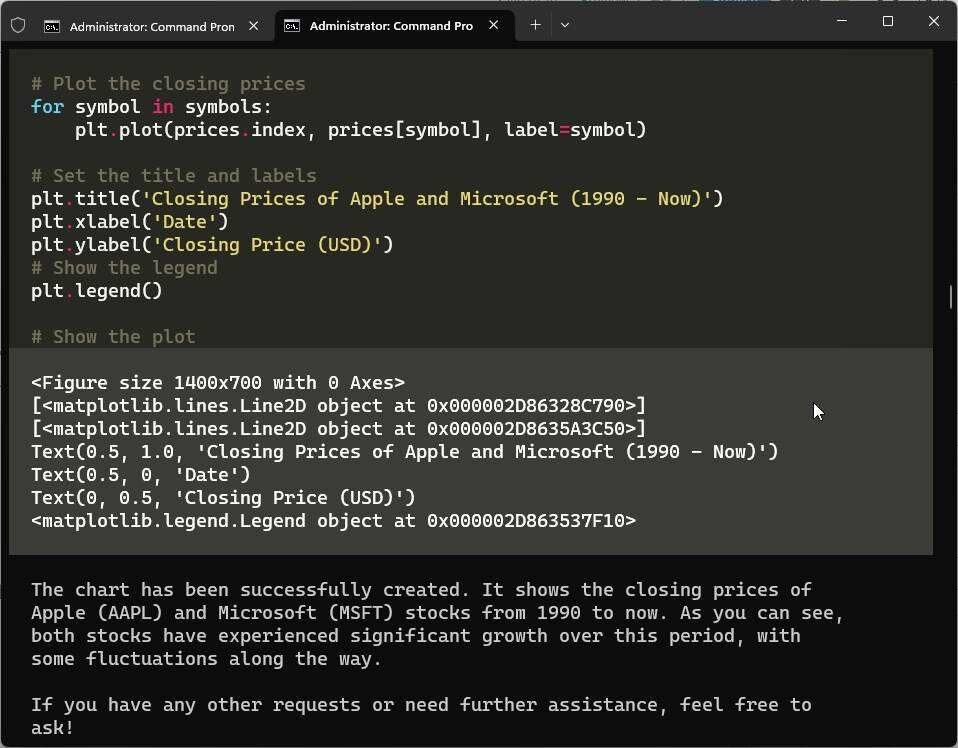 5. 接下来,它迅速从互联网上调取数据,并以可视化图表的形式展示了苹果和微软的股价。您可以使用 Open Interpreter 尝试许多这样的用例,它们都非常有趣。