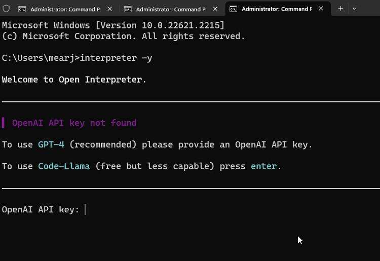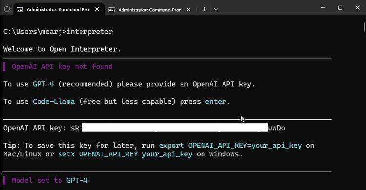 3. 在终端中粘贴 API 密钥,然后点击 Enter。顺便说一句,你可以随时按 “Ctrl + C” 键退出 Open Interpreter。