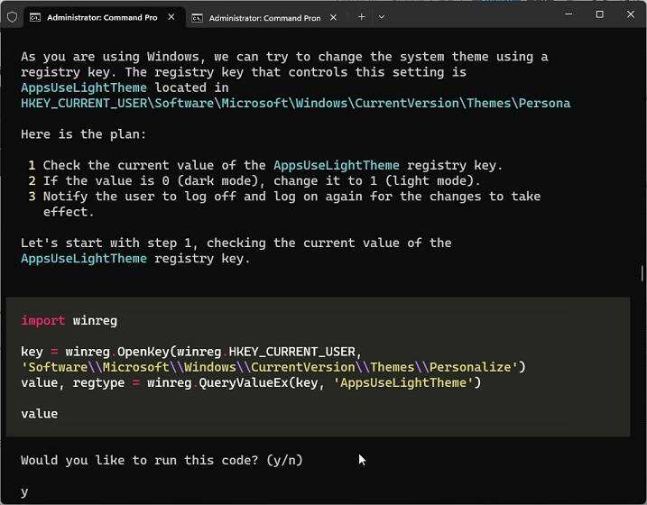 1. 开始使用 Open Interpreter 时,我要求它将我的系统设置为黑暗模式,结果成功了。由于我使用的是 Windows 系统,它创建了一个注册表键值,并无缝更改了主题。