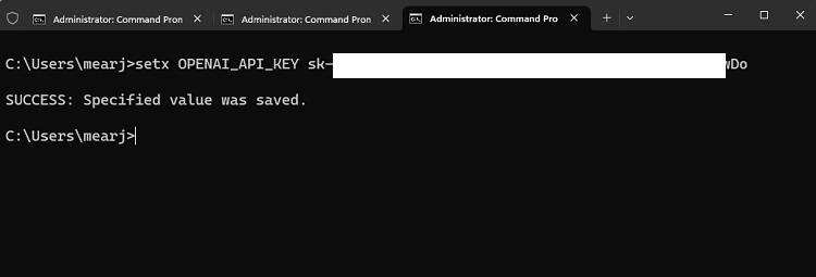 2. 接下来,你可以在命令行界面中按以下方式永久设置 OpenAI API 密钥。这将为您节省大量时间。将 ” your_api_key” 替换为实际密钥。